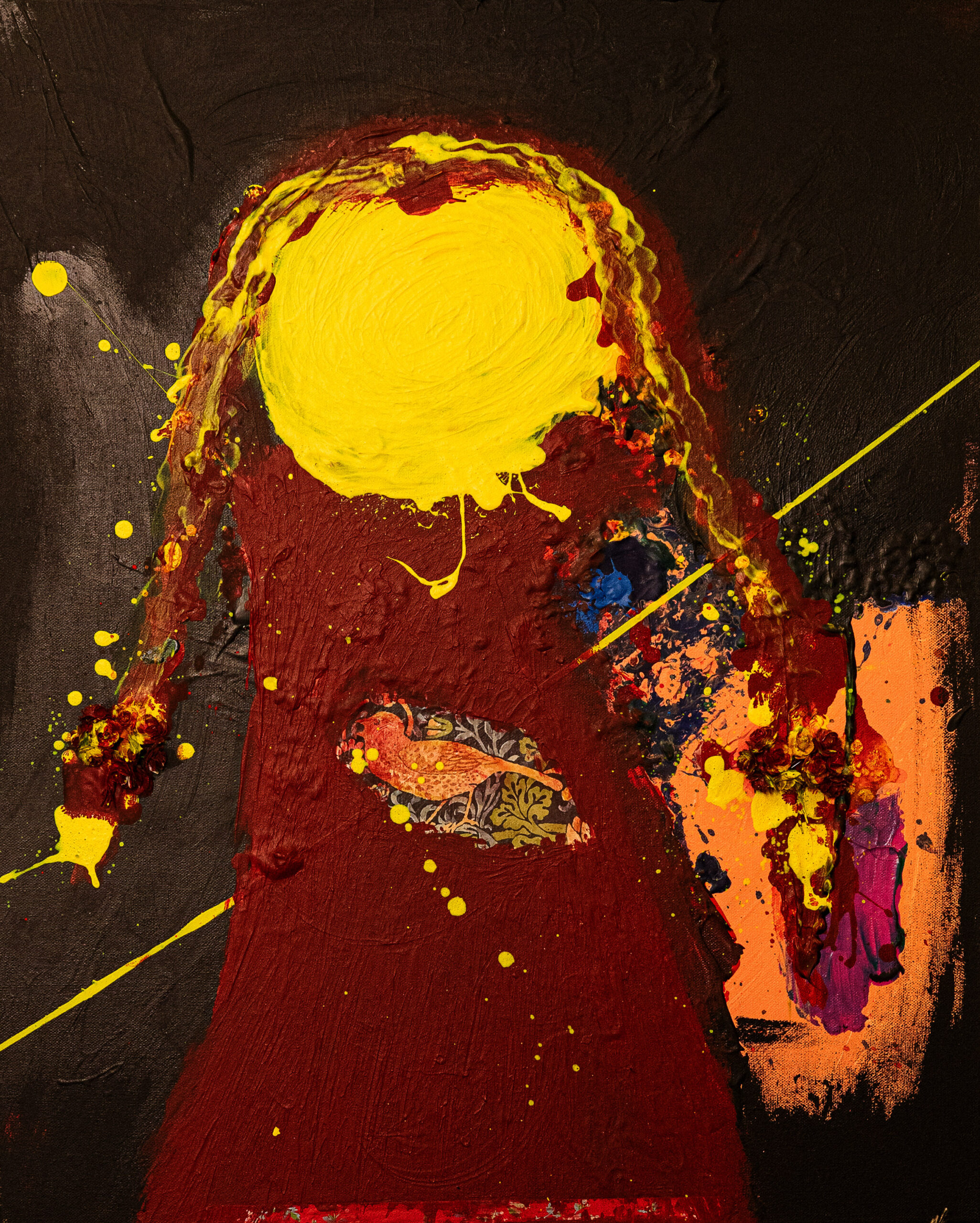 Color plays a central role in this process. It acts as both concealment and revelation — covering, protecting, but also exposing what cannot be articulated through form alone. The use of luminous tones, particularly yellow, introduces a subtle but persistent presence of light, symbolizing resilience, inner warmth, and the possibility of reconstruction even in states of fragmentation.
